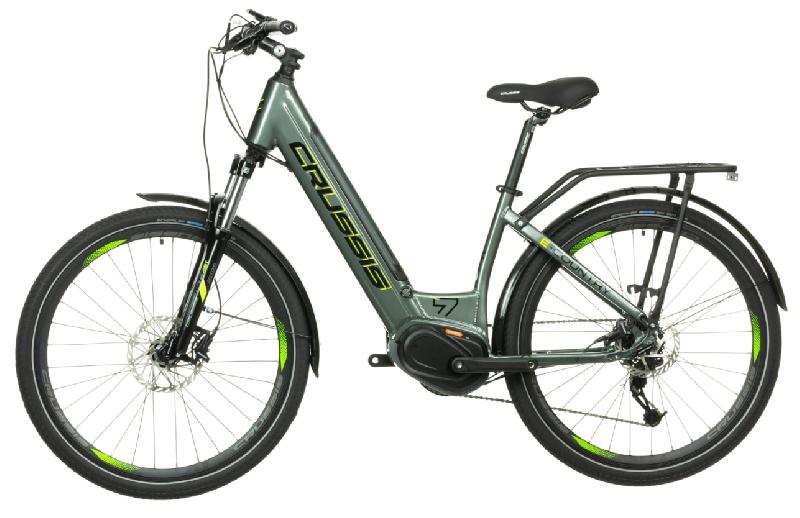 Cenově dostupné městské elektrokolo Crussis e-Country 7.8 (2023) se středovým motorem Bafang M400 na 27,5" kolech s kotoučovýma hydraulickýma brzdama a odpruženou vidlicí SUNTOUR XCT se zdvihem 100mm je často bráno také jako trekové elektrokolo s nízkým rámem pro snadný nástup. Plně integrovaná baterie Panasonic 14,5Ah (522Wh) v rámu vyniká atraktivním vzhledem.