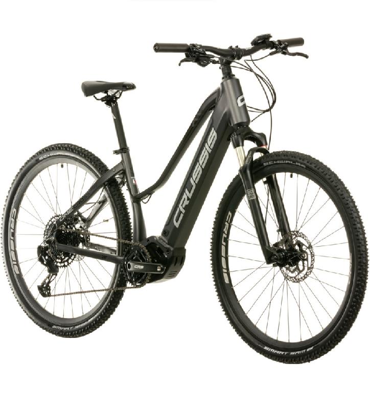 CRUSSIS e-CROSS low 9.9-M 2024 má kola 28 palců a pláště SCHWALBE Smart Sam 28 x1,75. Brzdy hydraulické kotoučové SHIMANO Deore BR-MT410, rotor 180mm/160mm a o tlumení se stará vzduchová ROCKSHOX FS Paragon Gold RL Solo Air 700c, zdvih 65mm, uzamykatelná z vidlice.