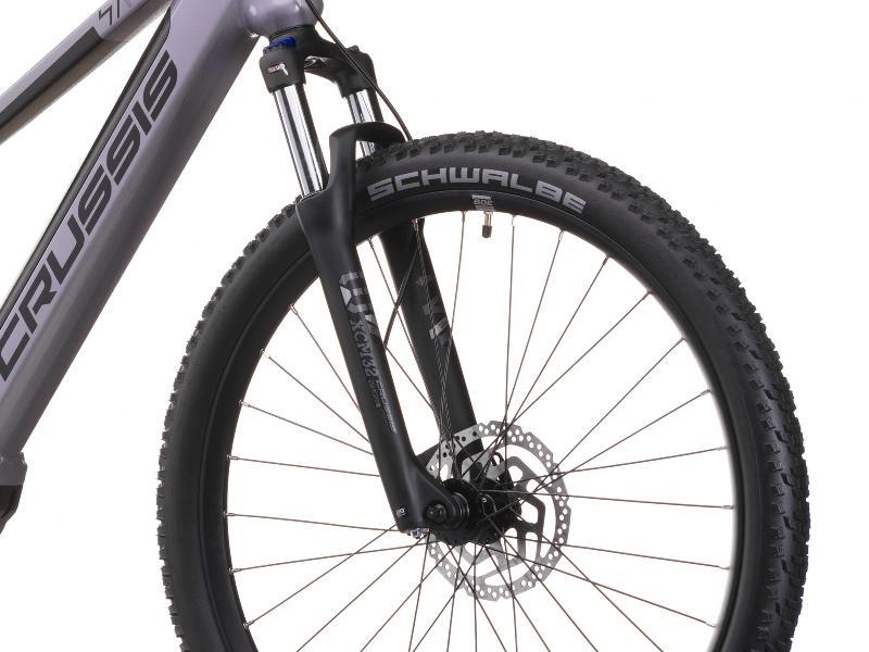 CRUSSIS e-Fionna 7.11-(715 Wh) 2026 má kola 29 palců a pláště SCHWALBE Smart Sam Performance 29 x 2,35. Brzdy hydraulické SHIMANO BR-MT200, hydraulická, rotor 180mm / 160mm a o tlumení se stará pružinová SR-Suntour XCM32 NLO DS 29, zdvih 100mm, uzamykatelná z vidlice.