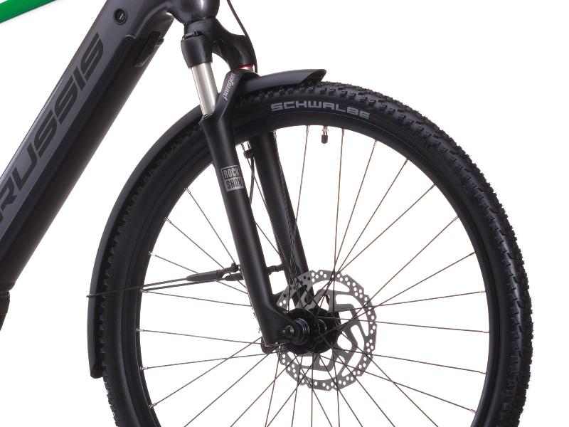 CRUSSIS e-Gordo 9.11-(715 Wh) 2026 má kola 28 palců a pláště SCHWALBE Smart Sam 28 x 1,75. Brzdy hydraulická kotoučová, SHIMANO Deore BR-MT410, rotor 180mm a o tlumení se stará vzduchová ROCKSHOX FS Paragon Gold RL Solo Air 700C, zdvih 65mm, uzamykatelná z vidlice.