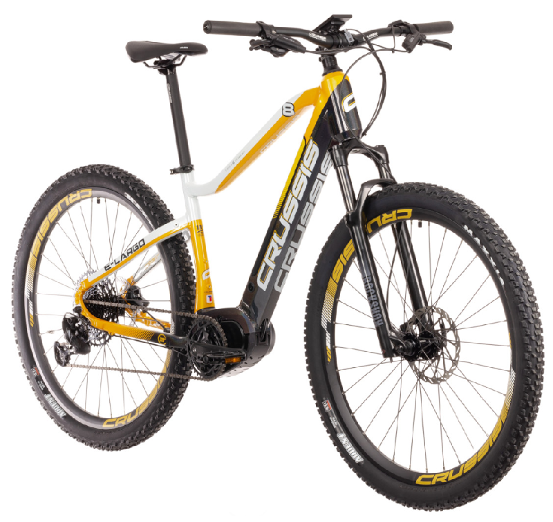 Horské elektrokolo Crussis e-LARGO 8.7-S (2022) je pro své neutrální zbarvení (černá, žlutá, bílá) často oblíbené jak u mužů tak i žen. Tento model je osazený kvalitním léty prověřeným nejprodávanějším motorem na světě Bafang M400 (Max Drive) a silnou plně integrovanou (odnímatelnou) značkovou baterií Panasonic 17,5 Ah (630Wh), kterou je možné nabíjet i mimo kolo. Toto elektrokolo je na kolech o velikosti 29“, která jsou obuta do bikových plášťů MAXXIS ARDENT 29 X 2,40 a vybírat můžete ze dvou velikostí rámu 18“ a 20“. Řazení obstarává špičková dvanáctirychlostní sada SRAM Eagle SX 12s a jízdní komfort vám zpříjemní kotoučové hydraulické brzdy SHIMANO Deore BR-MT410 nebo SRAM Level, vzduchová odpružená vidlice ROCKSHOX FS Judy Silver TK Solo Air 29", která je vybavena vzduchovým tlumením a disponuje zdvihem 100 mm.