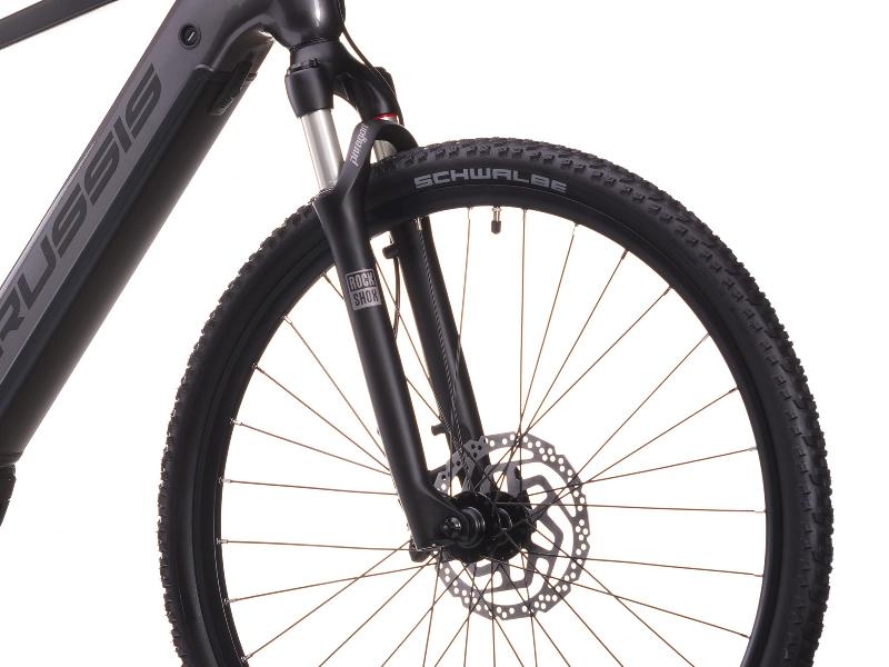 CRUSSIS ONE-Cross 9.11-(715 Wh) 2026 má kola 28 palců a pláště SCHWALBE Smart Sam 28 x1,75. Brzdy hydraulické kotoučové SHIMANO Deore BR-MT410, hydraulická, rotor 180mm/160mm a o tlumení se stará vzduchová ROCKSHOX FS Paragon Gold RL Solo Air 700C, zdvih 65 mm, uzamykatelná z vidlice.