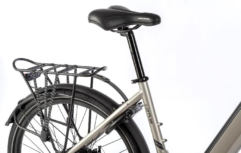 Elektrokolo LOTUS 2023 je již v základu vybaveno blatníky, předním a zadním světlem napojeným na baterii, praktickým zadním nosičem s nosností 15kg a stojánkem.