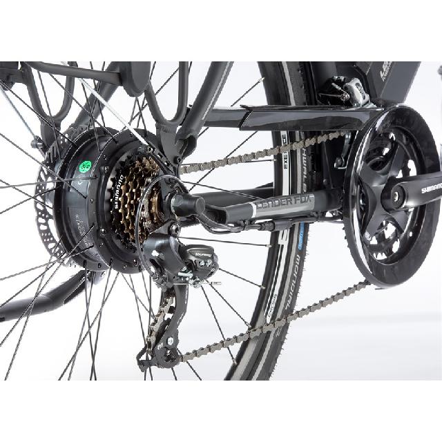 Zadní zapletený nábojový motor Bafang s nominálním výkonem 250W a max.výkonem 350W (EU NORMA EPAC EN15194) je vybaven technologií řízení, která se vyznačuje velmi tichým chodem, efektivnějším využitím energie a tím pádem také vyšším dojezdem na jedno nabití.