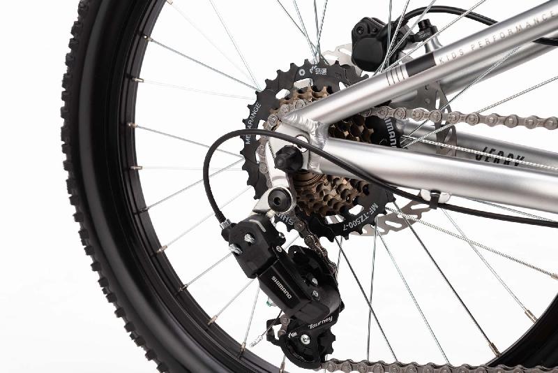Dětské horské kolo CTM JERRY 2.0 má hliníkový rám v barvě MATNÁ STŘÍBRNÁ, kola 20 palců, přehazovačku Shimano Tourney RD-TY200, 7 rychlostí 14-34z a brzdy hydraulické kotoučové TEKTRO HD / 6-bolt 160mm. Odpružení zajistí vidlice pevná Alloy unicrown 20.